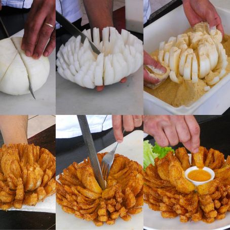 Usando uma espumadeira, mergulhar a cebola com o topo para baixo e fritar por dois minutos.