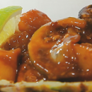 Purê de batat com salsa ao curry e abacaxi empanado com peito de peru defumado