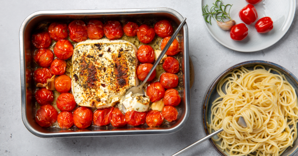 Uma receita de forno maravilhosa que nos deixa felizes: queijo feta mediterrâneo assado, tomate cereja frutado e espaguete delicioso.