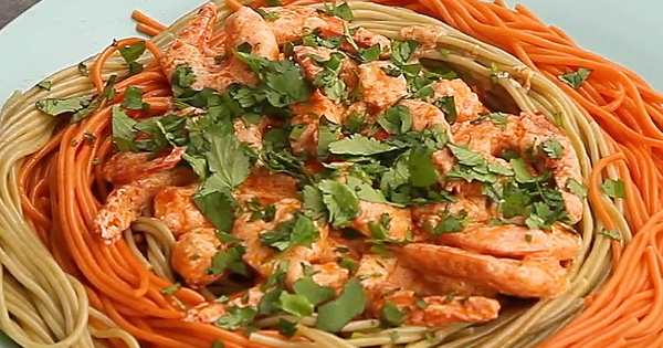 Rápido e fácil, este espaguete colorido com um delicioso molho cremoso de camarão vai te deixar babando! <3