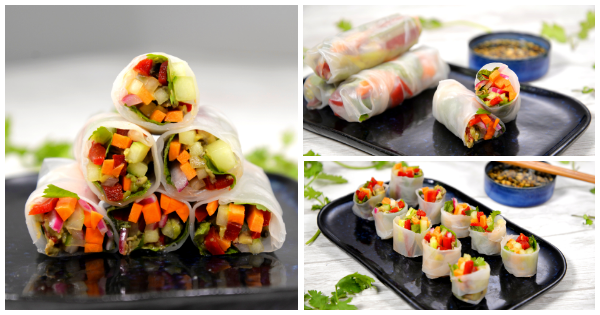 Esses rolinhos primavera frescos podem ser servidos inteiros, cortados ao meio ou no estilo maki-roll cortados em pedaços pequenos. Veja a receita completa abaixo.