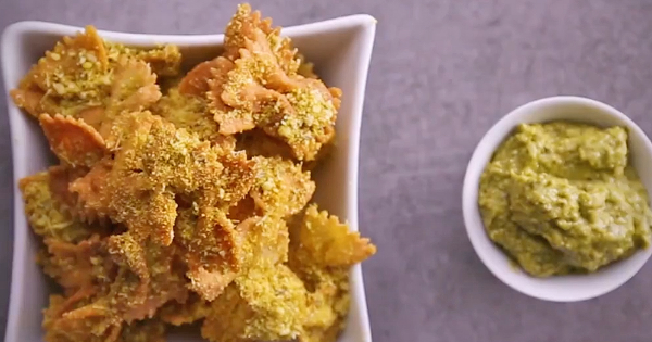 Que tal experimentar um aperitivo novo? Estes chips de macarrão gravatinha vão ser um sucesso!