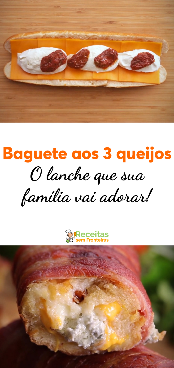 Para um lanche ou aperitivo perfeito, esta baguete aos 3 queijos vai encantar a todos e você ainda poderá substituir os queijos ou o tomate seco e ter um resultado diferente a cada preparação!