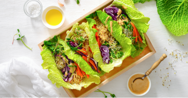 - Disponha as folhas de alface em uma travessa e, em cada folha, coloque a quinoa, palitos de cenoura, repolho roxo e as sementes germinadas.