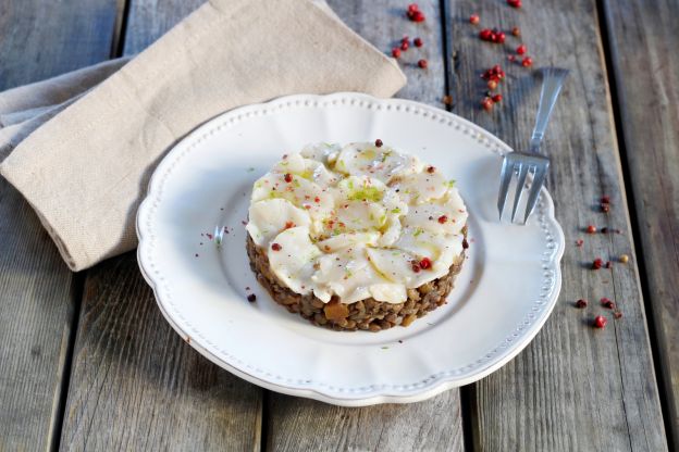 Carpaccio de vieiras e lentilhas