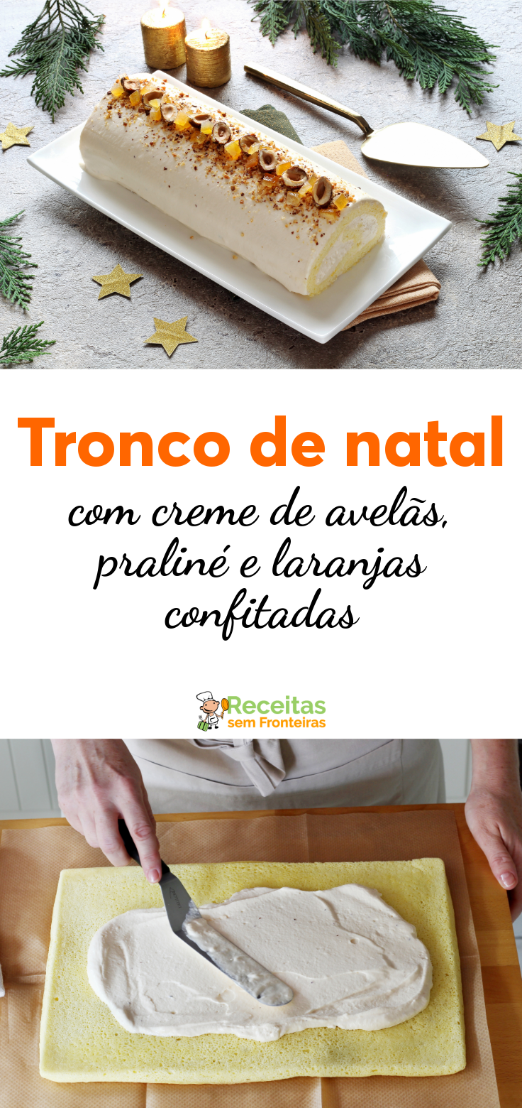 Tronco de natal com creme de avelãs, praliné e laranjas confitadas