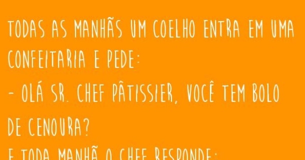O confeiteiro, os coelhos e o bolo de cenoura PorMélanie Moreira, 03/04/2015 Receitas sem Fronteiras 218 fãs Compartilhar Facebook Tweetar Pin it! Share on WhatsApp G+1 Outros artigos quentinhos, saídos do forno! Google Restaurante Querida, o que tem para a janta? Atende meu último pedido? Comentar este artigo