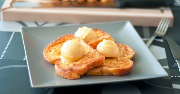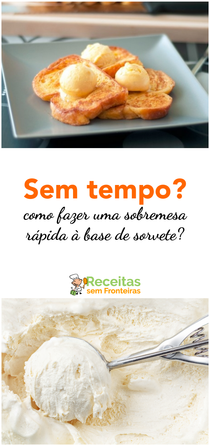 Molhe fatias de pão (ou brioche para uma textura mais macia) numa mistura de leite ou creme de leite, um ovo e açúcar. Passe as fatias numa frigideira untada com manteiga, dos dois lados. Coloque uma bola de sorvete de creme sobre cada fatia e , pronto, uma deliciosa sobremesa.