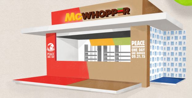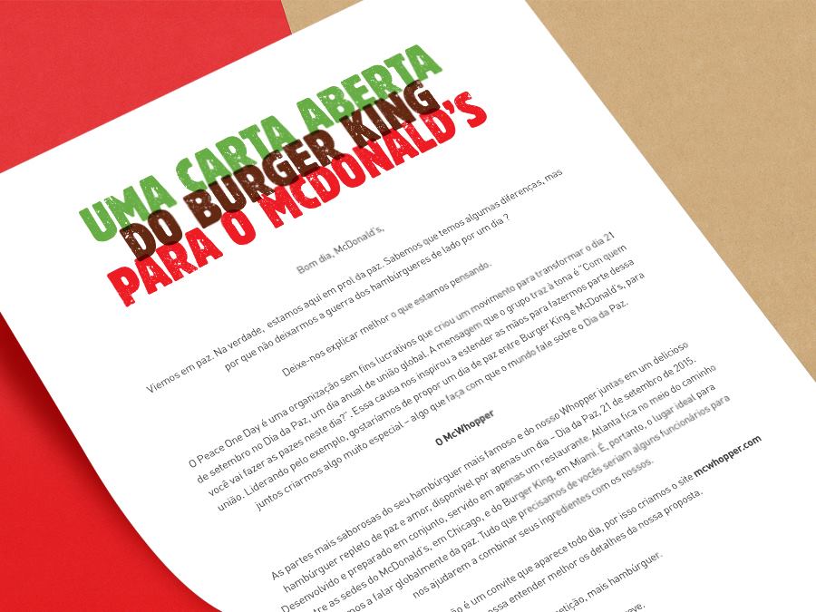 E é por conta desta data, buscando valorizá-la ainda mais nestes tempos de brigas, guerras e hostilidades, que o Burger King enviou uma carta pública ao McDonald's propondo uma trégua! Mas não é somente uma trégua na batallha das propagandas, é uma verdadeira trégua, forjada na união das duas redes que, durante 24 horas trabalhariam juntas em torno de um novo e temporário sanduiche, o esperado McWhooper!
