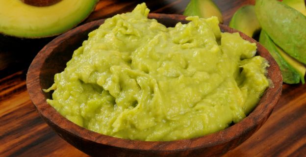 Mistura de abacate amassado, cebola, suco de limão e coentro, a guacamole é ideal para ser colocada em wraps de frango, peru ou legumes grelhados, tudo relevado com um pouco de tabasco.