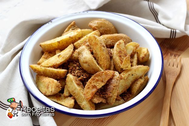 Basta pegar 3 batatas, cortá-las em 4 no sentido do comprimento, sem tirar as cascas e depois regar com bastante azeite, polvilhar 50 g de queijo parmesão ralado, sal, páprica (doce, picante ou as duas), ervas de Provence e alho em pó. Dispor as batatas sobre um papel manteiga em um tabuleiro e levar ao forno para assar por 10 minutos a 180°/200°C.