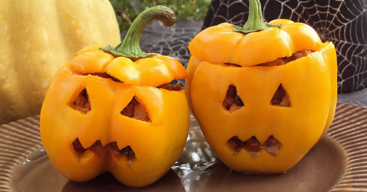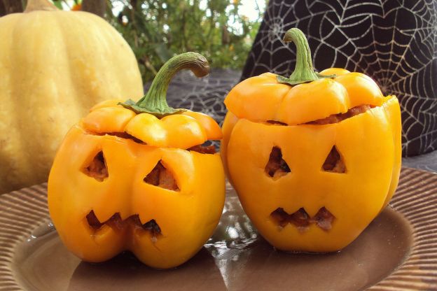- Em seguida, recorte, usando uma faca, uma das faces do pimentão, dando-lhe o aspeto de uma abóbora de halloween (fazendo olhos e boca). Tempere o interior do pimentão com sal e um unte-o, ligeiramente, com azeite.
