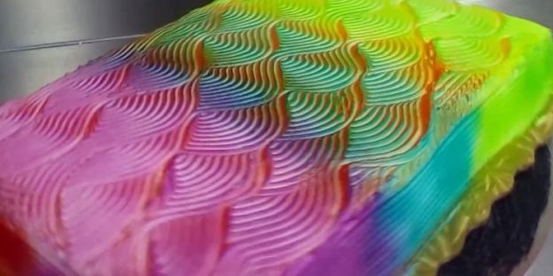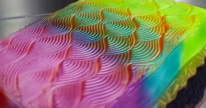 O bolo foi coberto com uma glace. Com uma espátula dentada, formamos, dando um movimento de ondas, pequenas cristas na superfície, dirigidas seja para a direita seja para a esquerda. A parte superior do bolo foi em seguida colorida com corantes laranja e amarelo e com um ângulo que vai tocar somente as cristas dirigidas para a esquerda depois com corantes azuis e violetas com um outro ângulo a fim de tocar somente as cristas dirigidas para a direita.