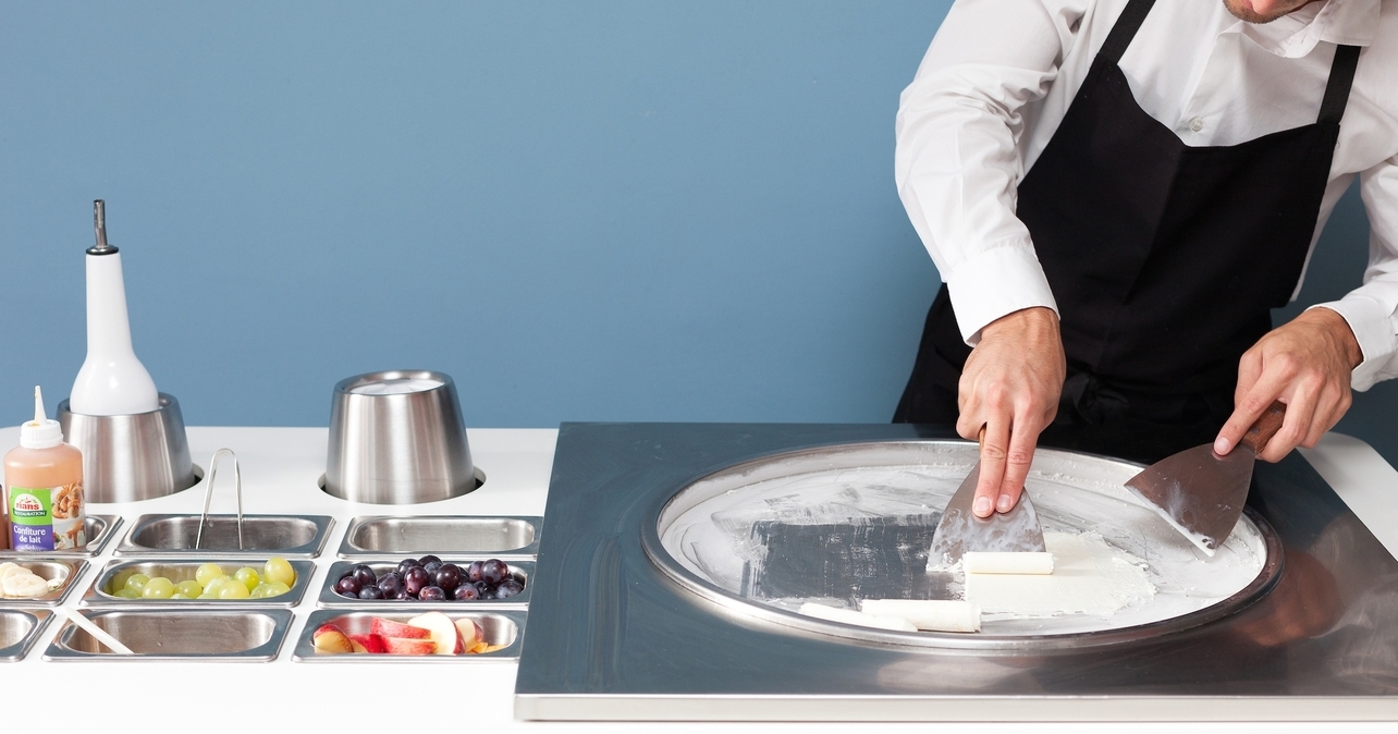 Os sorveteiros derramam uma base líquida (à base de leite integral, açúcar e creme de leite, às vezes chocolate) preparada todo dia, sem conservantes e com produtos de grande qualidade, sobre uma grande chapa refrigerada a -30°C. São colocados a seguir ingredientes, como frutas frescas mixadas, caramelo, etc. Começa a seguir o espetáculo: graças a uma espátula e a uma grande destreza, a mistura é manipulada até que seja possível destacar tiras e as enrolar num belo gesto.