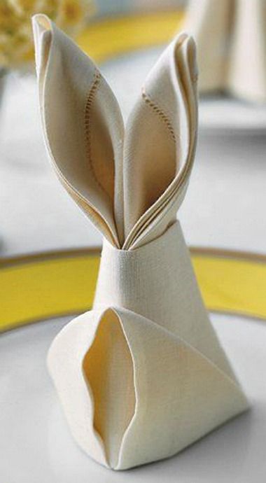 Estes adoráveis guardanapos em forma de coelho são uma ótima idéia para decorar sua mesa de Páscoa com bom gosto e ainda se divertindo (com ou sem crianças!). Você pode fazê-los com os guardanapos de pano ou papel, brancos ou coloridos... o processo é fácil, mas o efeito final é garantido! Todos vão adorar!