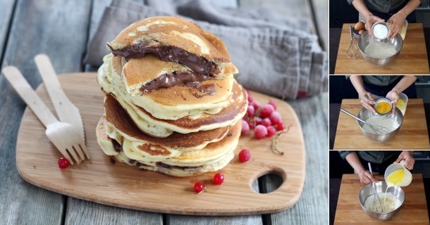 As tradicionais e deliciosas pancakes vão dar um novo sabor aos lanches, com este toque de Nutella. No café da manhã também é uma delícia!