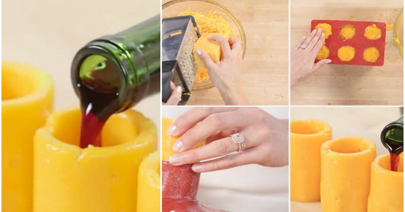 Para fazer os copos, PopSugar propõe utilizar o queijo Cheddar (mas você pode tentar com prato, Gouda, o importante é que, depois de frio, ele solidifique) , ralar e fazê-lo derreter no micro-ondas em pequenas sessões de 30 segundos, mexendo entre cada sessão, para obter uma bela massa de queijo fundido.