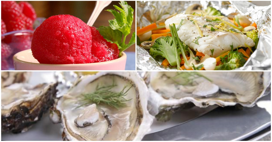 Como entrada: viva os produtos do mar que são por definição leves: camarões, lagostim, carpaccio de vieiras ou salmão, tartare de salmão, ostras,etc.
