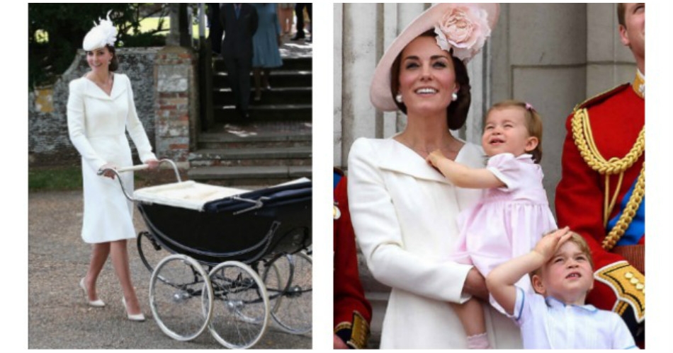 Nas fotos superiores vimos a duquesa de Cambridge usar o mesmo vestido branco de Alaxander McQueen: no primeiro caso no batizado da filha Charlotte em 5 de junho de 2015, na segunda foto nos 90 anos da Raínha Elizabeth em 11 de junho de 2016.