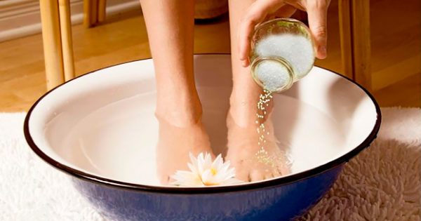 Colocar a água morna em uma bacia. Adicione o bicarbonato e o sal e misture bem. Mergulhe os pés na mistura e deixe por 15 minutos. Finalmente, esfoliar os pés com pedra-pomes e enxugar.