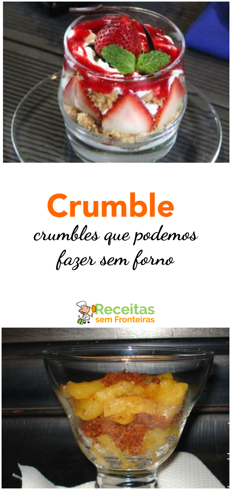 Uma deliciosa torta típica da Inglaterra, o crumble normalmente leva uma base de frutas com uma espécie de farofa, o crumble, por cima e depois é assada no forno. A farofa geralmente tem uma fruta seca para dar a crocância e o sabor, além de farinha e muita manteiga!