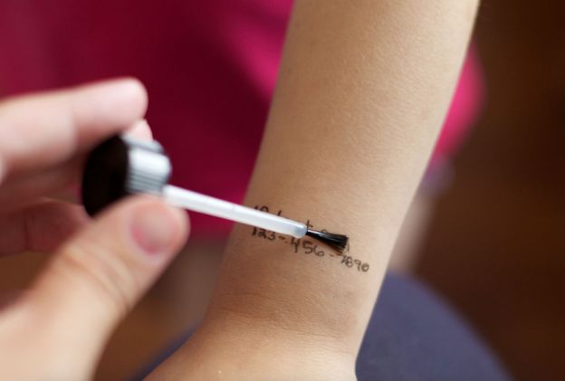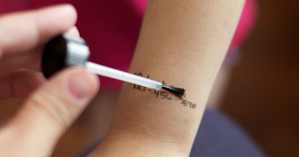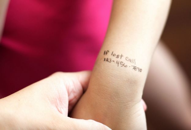 Com um marcador permanente, escreva seu número de telefone no braço da criança e passe esmalte incolor sobre o escrito para que ele não se apague.