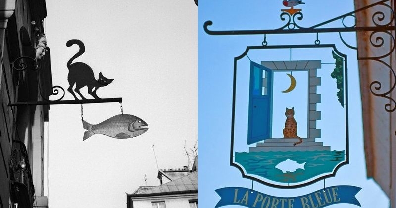 Na Europa, sobretudo na França, silhuetas de gatos, pretos em especial, se transformam em marcas registradas de lojas através de painéis instalados em suas fachadas. Vejam alguns exemplos.