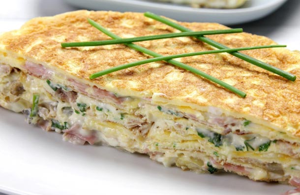 Aquecer um pouco de óleo em uma frigideira. Bater os ovos em uma tigela, adicionar sal e pimenta a gosto. Despejar 1 ou 2 colheres de sopa de ovo na panela para fazer uma tortilha fina. Quando estiver pronto, reservar em um prato. Continuar fazendo tortilhas até terminar com os ovos. Enquanto isso, cozinhar peito de frango . Cortar em pedaços pequenos e reservar. Picar o coentro, cebolinha e espinafre, se você quiser acrescentar . Para montar sua torta, colocar uma tortilha de ovo em um prato. Adicionar um pouco de frango, presunto, queijo cottage e polvilhar ervas frescas picadas. Cobrir com outra tortilha e repetir o procedimento, mantendo sempre uma tortilha para o final. Pode ser servido frio ou quente a gosto, acompanhado de salada.