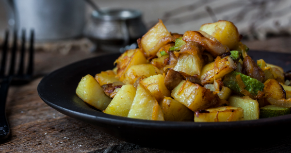 Preaqueça o forno a 200°C. Prepare as batatas cortadas em cubos e cozinhe-as em uma panela antiaderente até que fiquem douradas. Coloque as batatas num canto da panela e refogue o alho, junte as ervas o sal e a páprica. Misture tudo para que fiquem aderidos às batatas. Salpique as batatas com queijo parmesão e salsa, coloque alguns quadradinhos de manteiga e leve ao forno por cerca de 15 minutos.