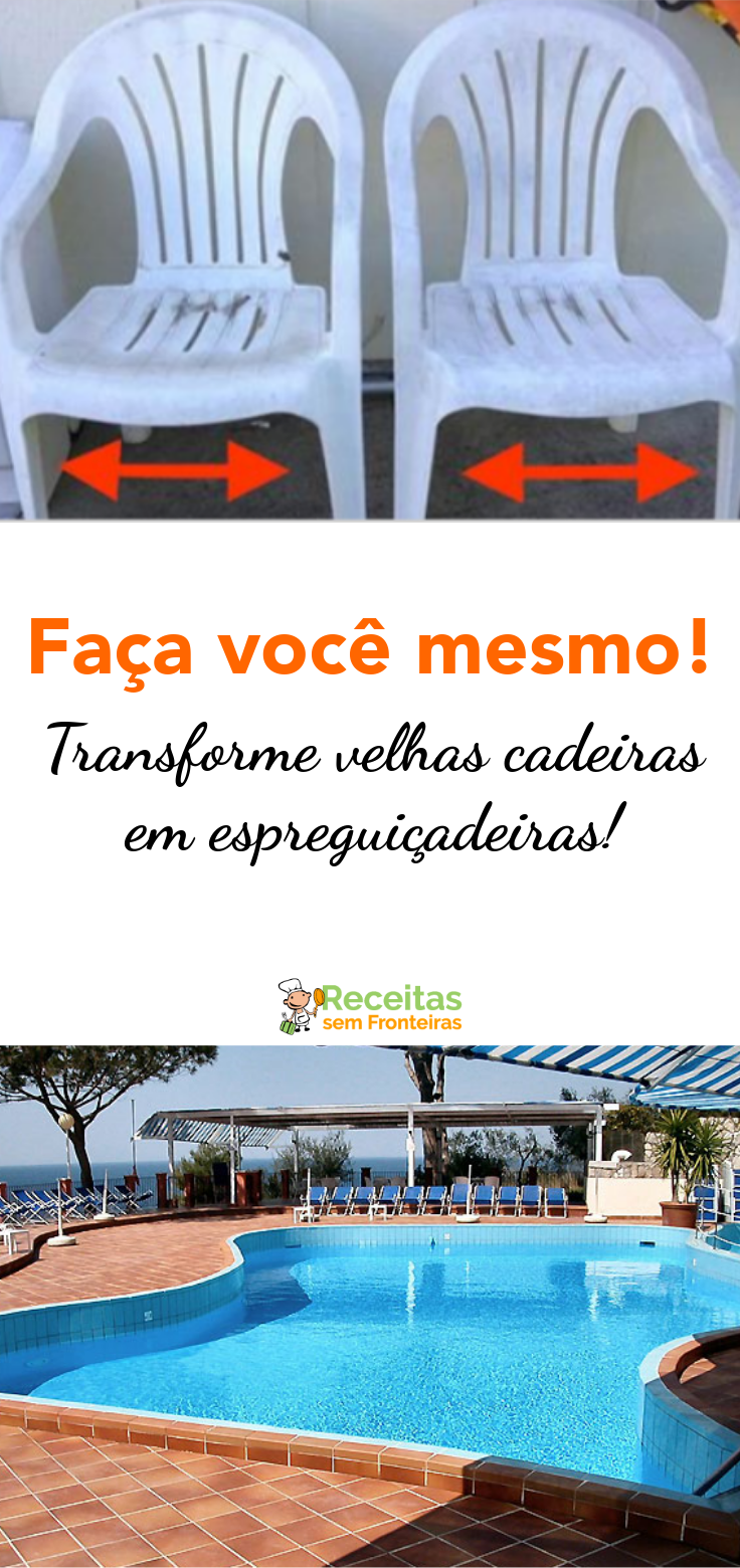 Comece a recuperar as cadeiras antigas lixando-as com uma boa lixa por toda a superfíce, até ficarem brancas. Depois de ter abundantemente lavado com água fria, escolha cores de tintas acrílicas em spray e pinte as cadeiras. Em seguida, corte as 4 pernas se quiser que elas fiquem mais baixinhas , do lado da piscina. Deixe a cor secar e depois ... coloque-os na piscina, sente-se e ... Relaxe.