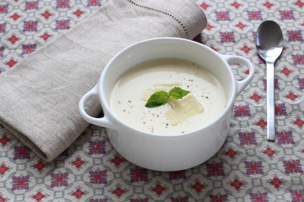 Antes de servir o creme, adicione Grana Pedano ralado e algumas folhas de manjericão.