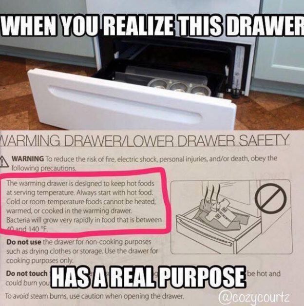 Este suposto compartimento mais ou menos supérfluo, que todos nós enchemos de formas de muffins, panelas e tabuleiros, foi completamente incompreendido pelo mundo. Tem uma função e não é nenhum espaço para armazenamento, mas uma gaveta de aquecimento! Por exemplo, se você convidou vários pessoas e você não pode terminar todas as refeições ao mesmo tempo ou não são para serem comidas imediatamente, esta gaveta salvará sua vida (ou, pelo menos, caprichará para os convidados, que poderão desfrutar de uma refeição quente).