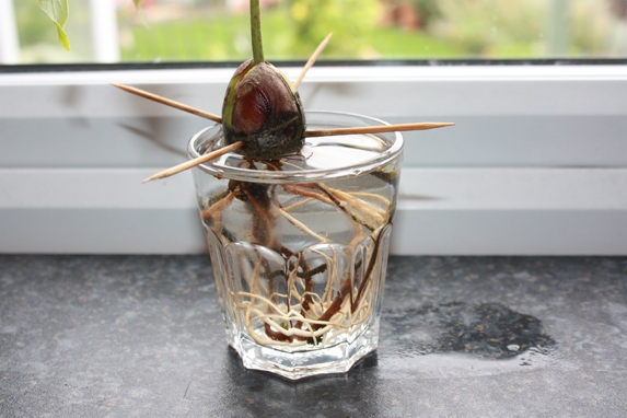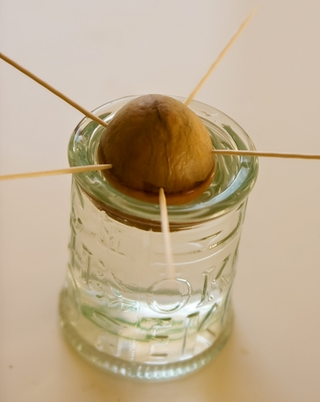 Em seguida, coloque 4-5 palitos de dentes ao longo da circunferência da semente, aproximadamente a meio palito para dentro. Agora mergulhe somente a metade do caroço em um copo de água, os palitos evitarão de afundar.