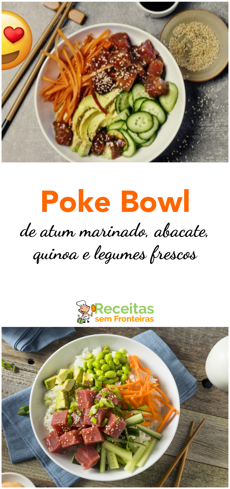 Poke Bowl de atum marinado, abacate, quinoa e legumes frescos