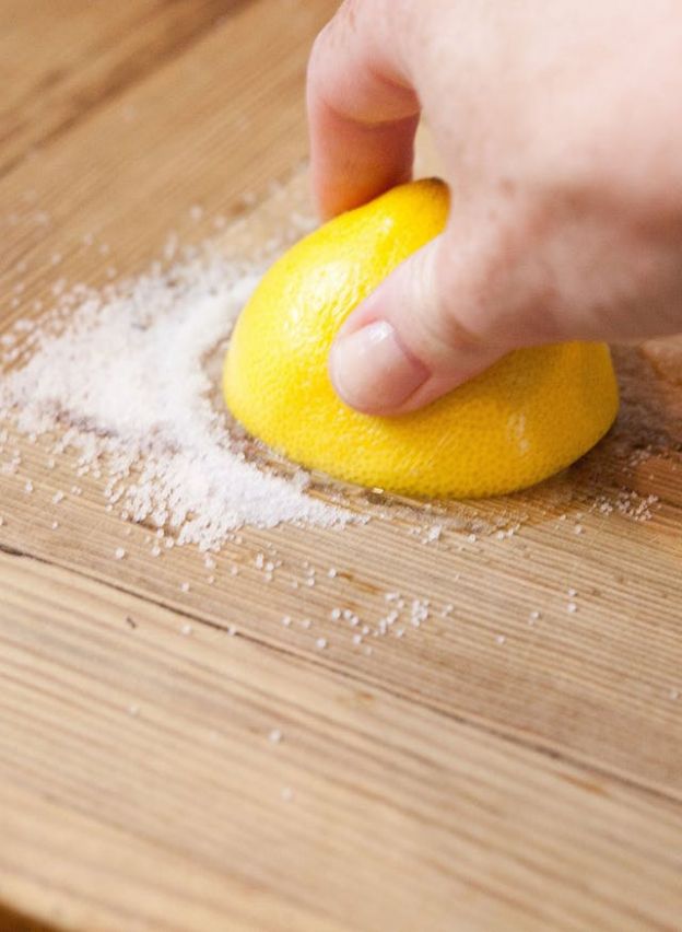 - Limpe a superfície: use meio limão para esfregar toda a área de corte. Esprema o limão levemente para que o suco se ligue aos grãos de sal.