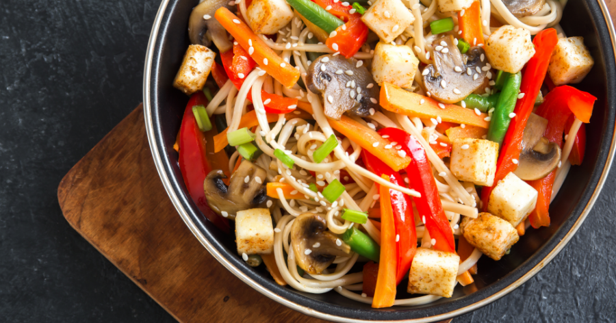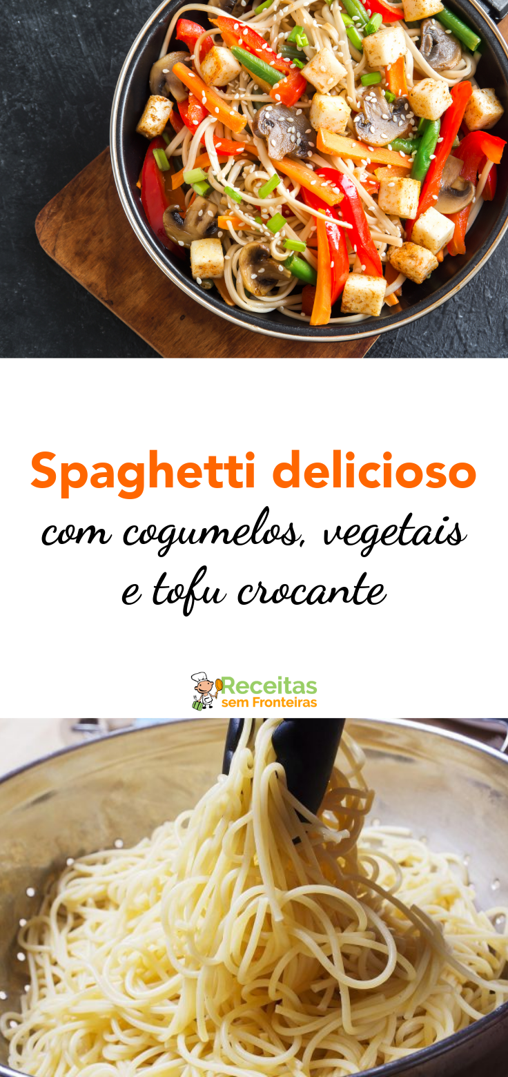 Delicioso espaguete com tofu crocante, cogumelos e legumes!