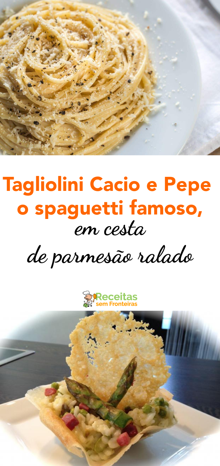 Nota: o ideal é fazer a cesta primeiro e reservar. Assim, enquanto você prepara a massa, dará tempo suficiente para que ela solidifique ao ponto de crocância. A cesta de parmesão é uma tradição do restaurante "Roma Sparita", no bairro de Trastevere, na Itália, onde Bourdain gravou um dos episódios do seu programa, ocasião em que disse que sacrificaria sua primeira experiência sexual só para experimentar o taglioline cacio e pepe.