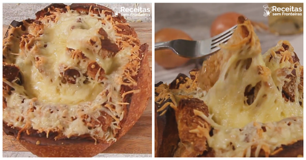 - Dentro do seu pão, adicione 100 g de queijo Gruyere ralado ao fundo. Asse por alguns minutos até que o queijo derreta.