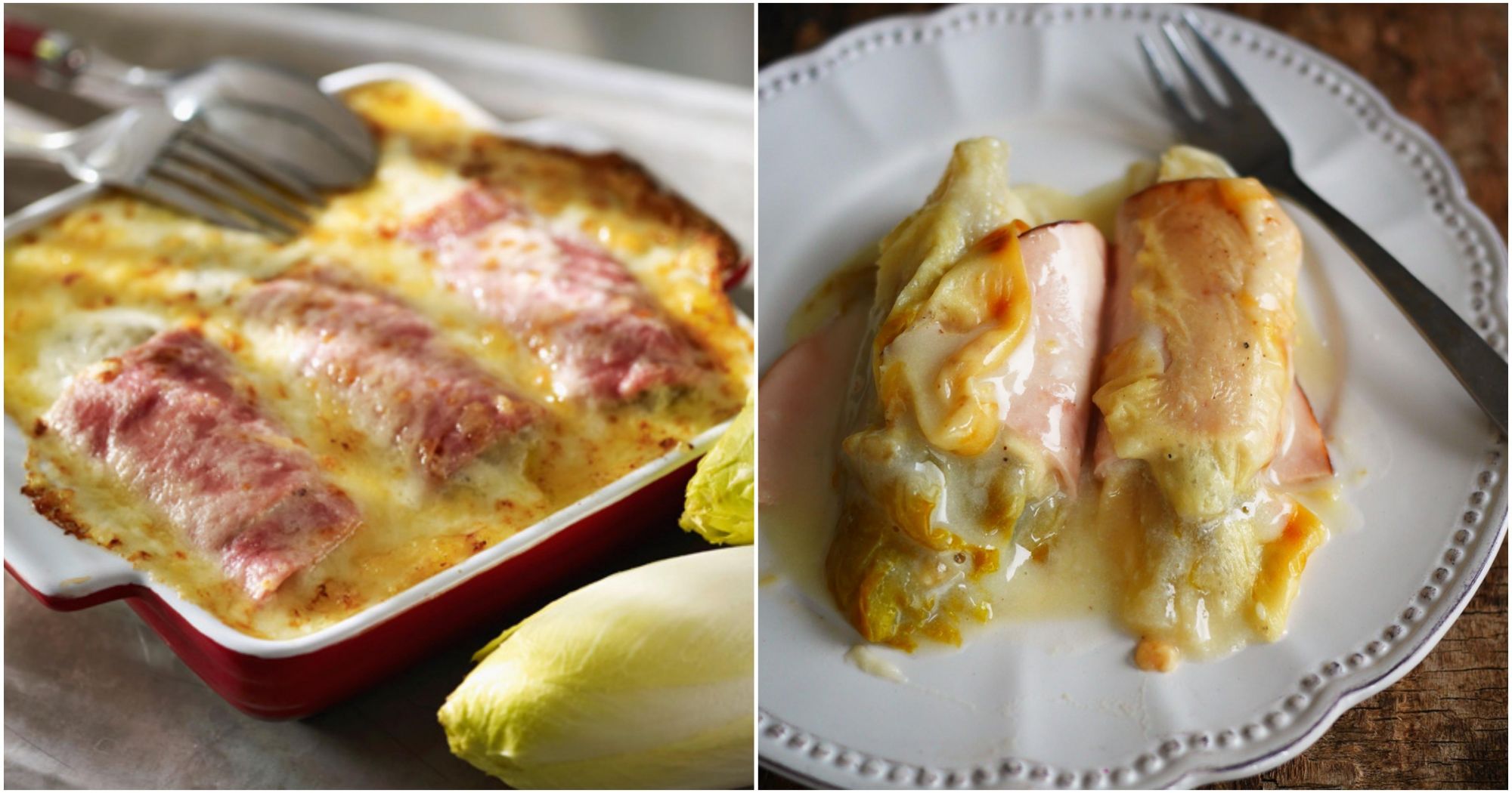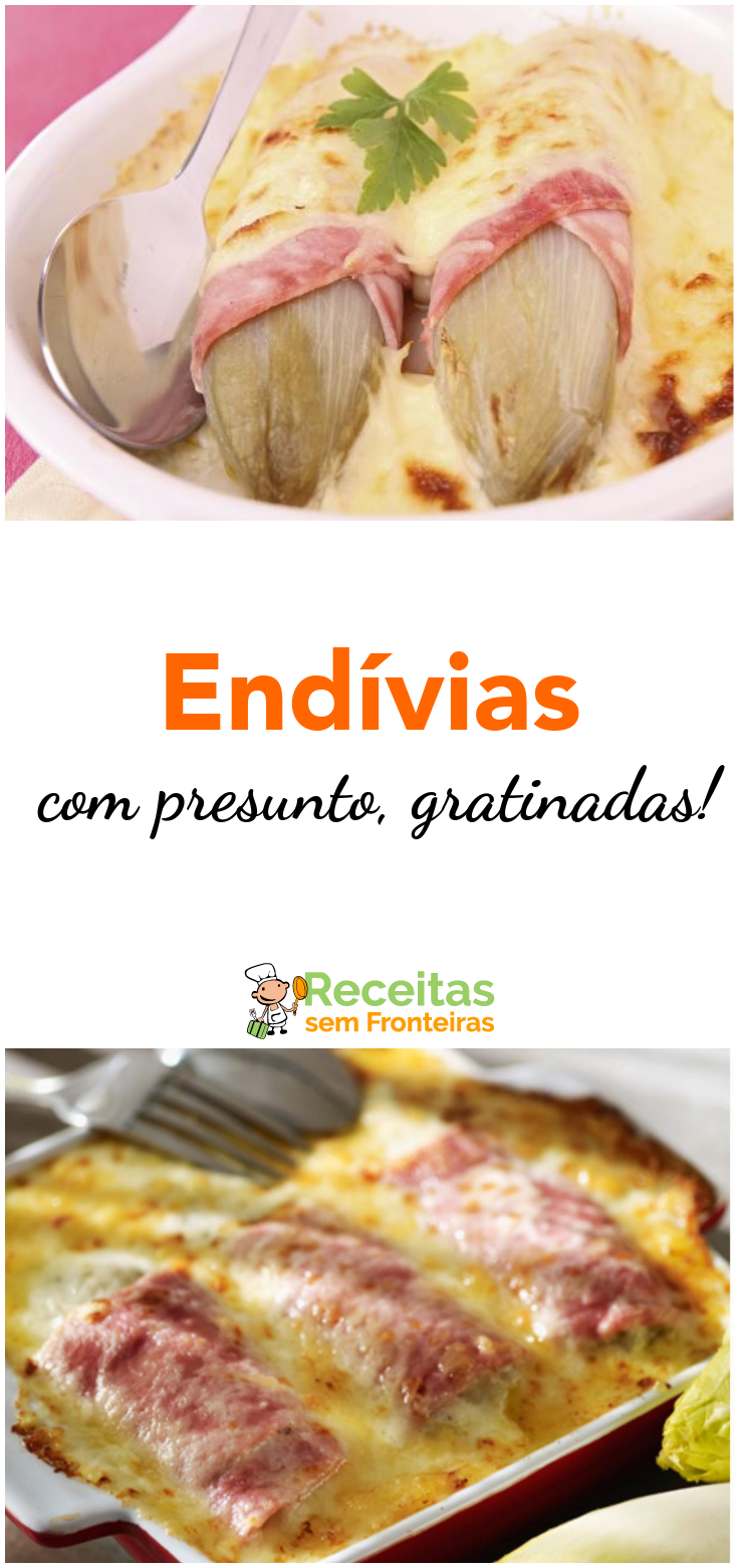 - Montagem: enrole as endívias nas fatias de presunto, coloque num refratário. Cubra com o molho Mornay e salpique o queijo Gruyère ralado. Leve para gratinar por 30 minutos.