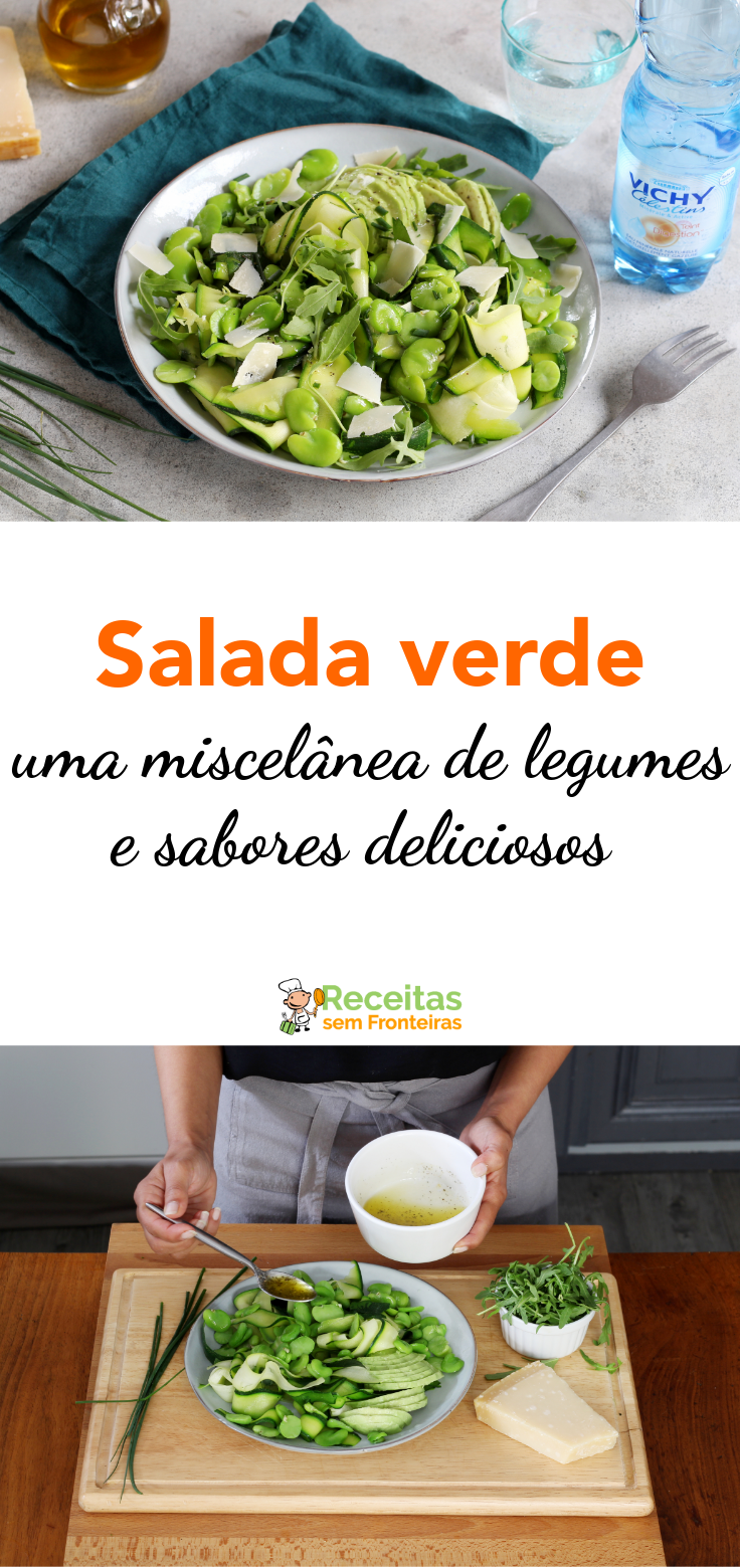 Salada verde - paraíso de abobrinha, abacate, favas e rúcula com molho delicioso!