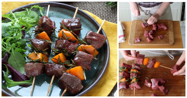 Espetinhos deliciosamente aromáticos de peito de pato, damascos e alecrim