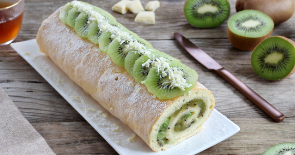Rocambole deliciosamente frutado com recheio caseiro de kiwi.