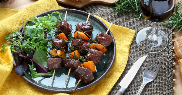 Espetinhos de peito de pato, damascos e alecrim!