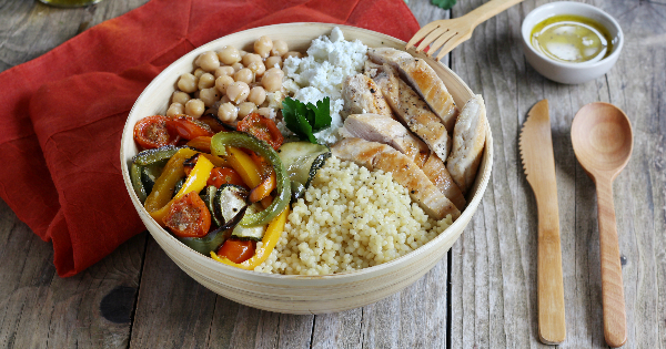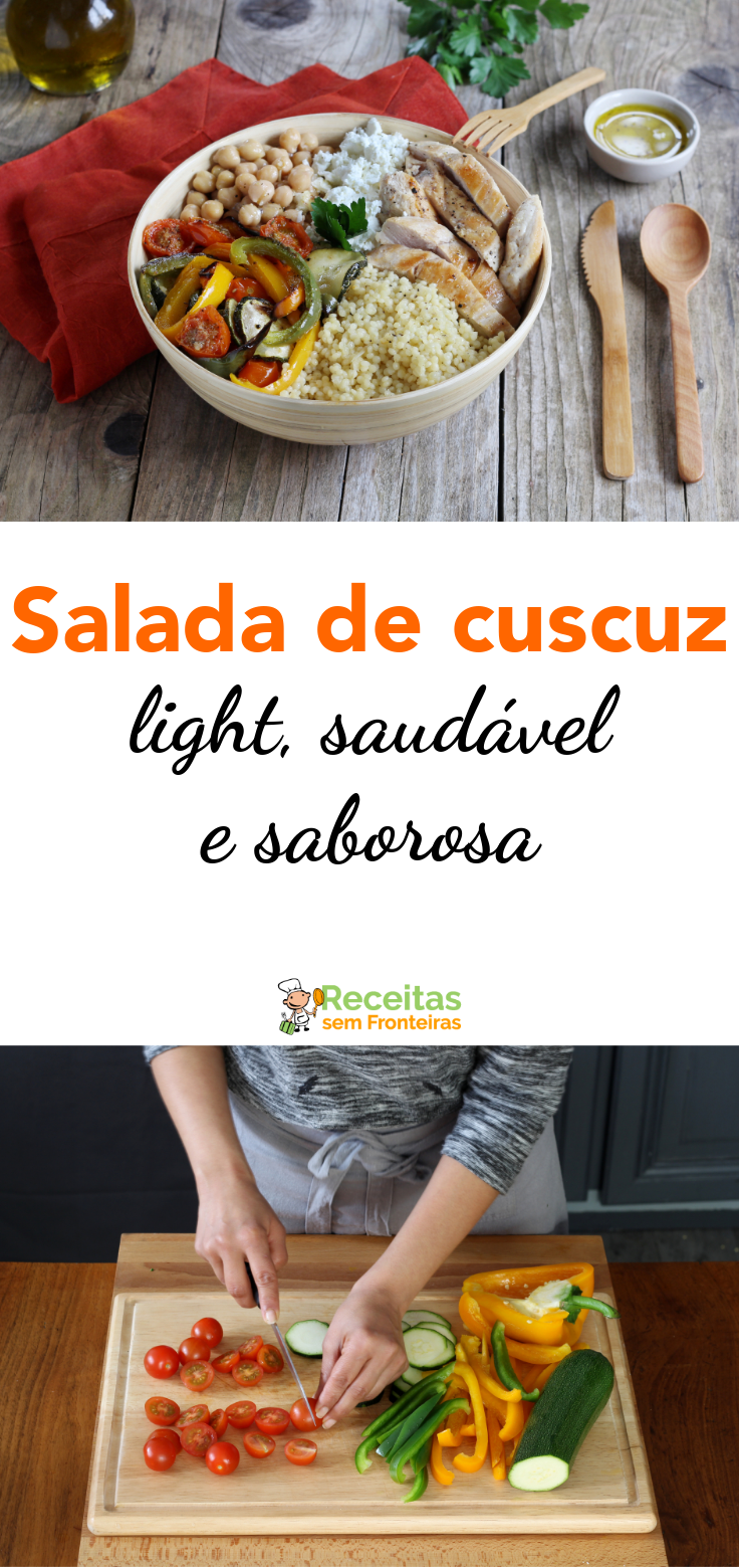 Salada super saudável de cuscuz, grão de bico, legumes e frango!