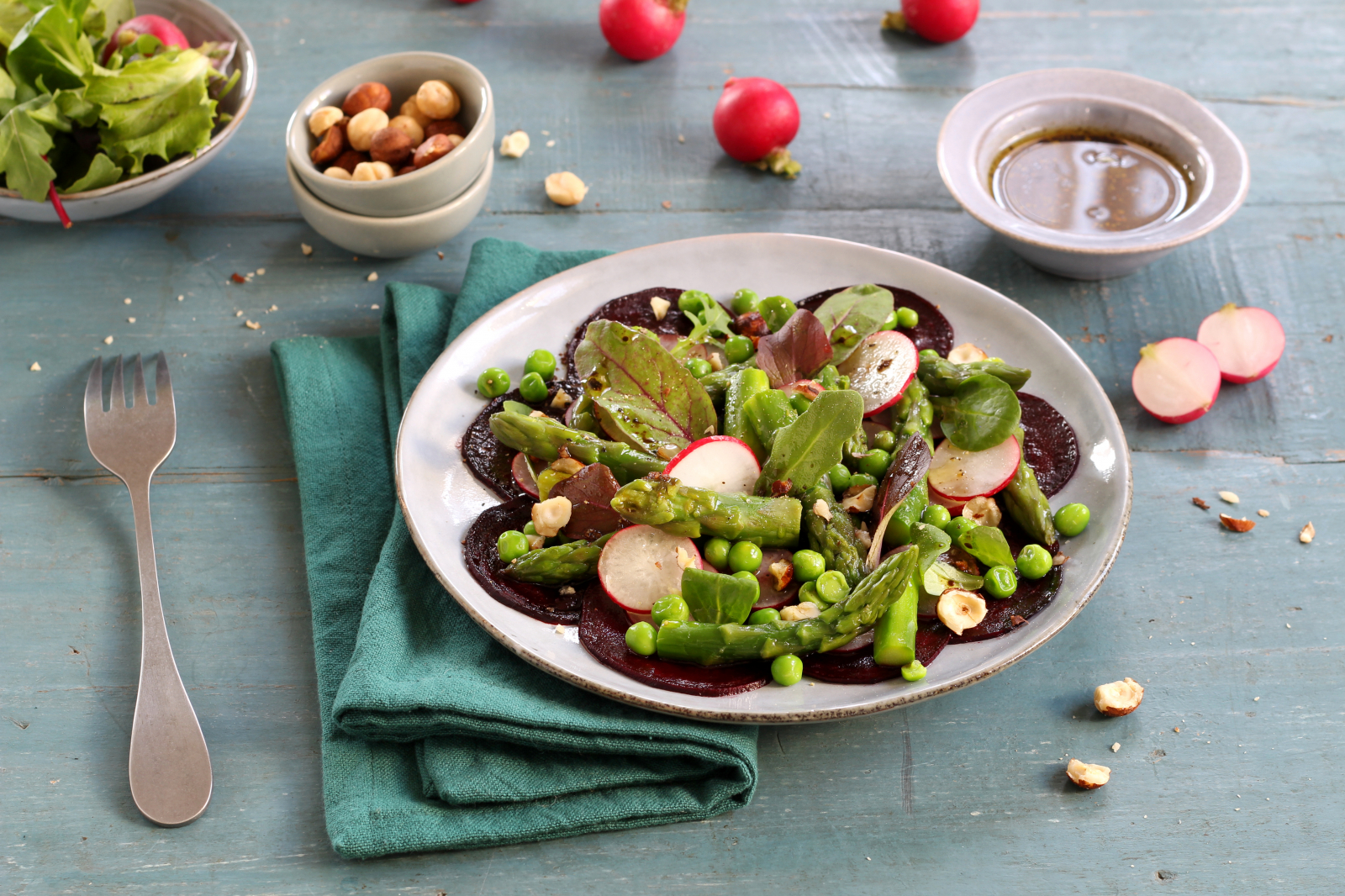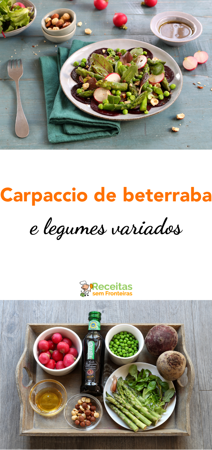Este carpaccio de beterraba vegetariana é acompanhado por todos os tipos de deliciosos vegetais saudáveis, incluindo aspargos e rabanetes. Saborosíssimo!
