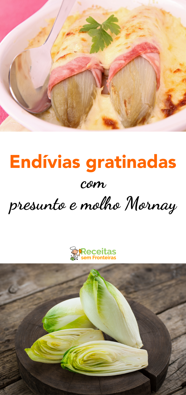 Montagem: enrole as endívias nas fatias de presunto, coloque num refratário. Cubra com o molho Mornay e salpique o queijo Gruyère ralado. Leve para gratinar por 30 minutos.