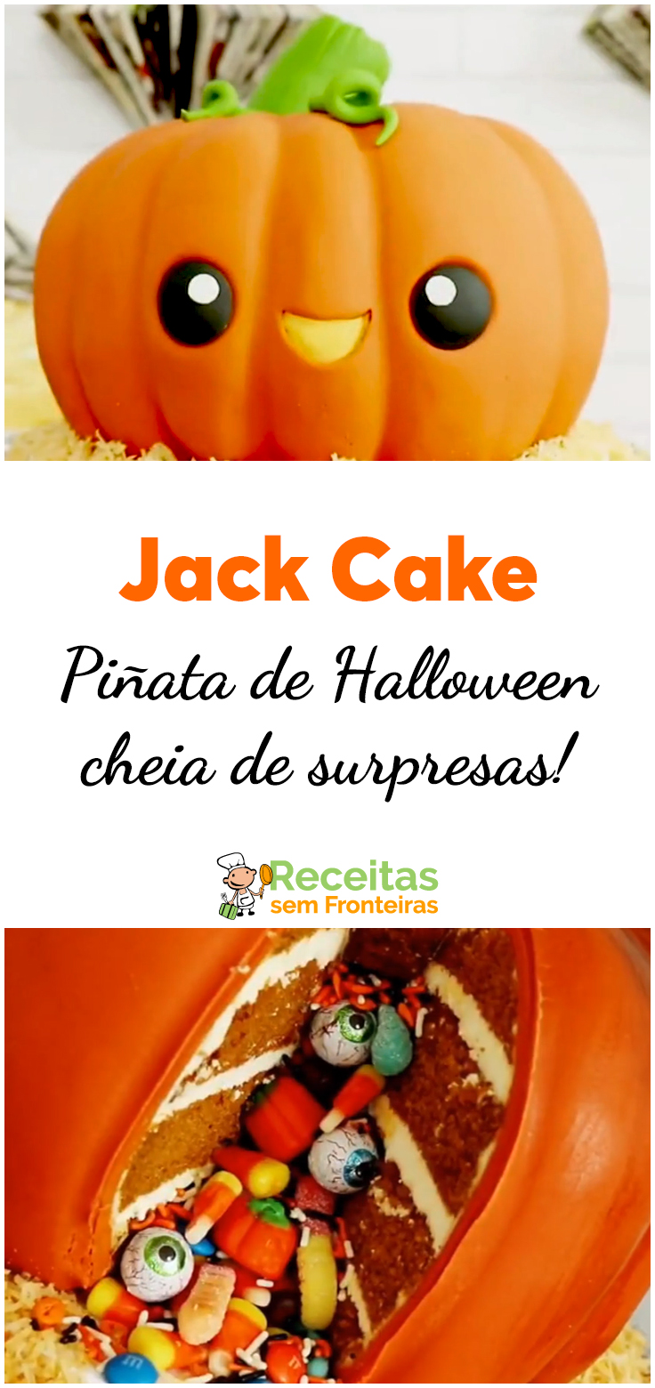 Uma simples massa de bolo de cenoura (pra ficar bem alaranjada- se quiser, adicione um pouco de corante alimentício) e um buttercream para recheio. Cubra com pasta americana conforme indicado no vídeo. O recheio surpresa fica a seu critério, mas opte por balas com temática de Halloween: dentadura, olhos, minhocas...