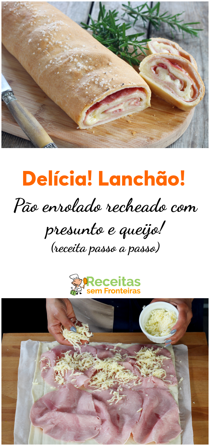 Este lanchão de presunto e queijo em versão rocambole é a pedida excelente para um lanche ou até um jantarzinho acompanhado de uma salada.
