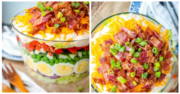Uma receita clássica de salada de 7 camadas nunca sai de moda. Ela é fácil de fazer, você só precisa ir colocando ingredientes simples em camadas, cobri-los com um molho saboroso e deixar refrigerando durante a noite. Um acompanhamento fácil, bonito e pronto para alimentar uma multidão!
