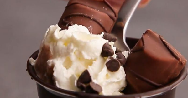 Imagina um copo feito de chocolate, recheado com um creme de Nutella e pedaços de Kinder Bueno, tudo coberto com muito creme Chantilly e mais chocolate... Ai!